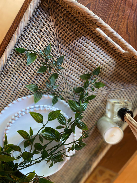 A small handmade rattan morning tray in a natural and grey weave 33 x 20 x 5 cm