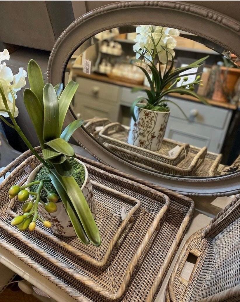 A beautifully handmade Myanmar rattan tray in a natural and washed grey. It is extremely sturdy with a tight weave and two handles, perfect for books/plant styling etc. Measures 33 x 20 x 5 cm Delivery now available to USA Available in three different sizes so they sit inside each other and also in an oversized Ottoman size We have limited stock