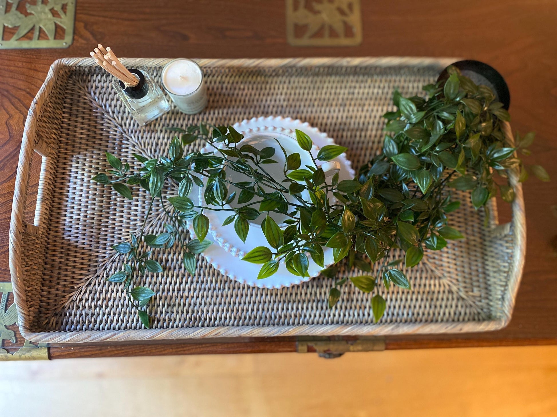A beautifully handmade Large Myanmar rattan tray in a natural rattan and washed grey. It is extremely sturdy with a tight weave and two handles, perfect for books/plant styling etc. Measures 57 x 35 x 8 cm We have two separate listings with two different sizings. We have limited stock